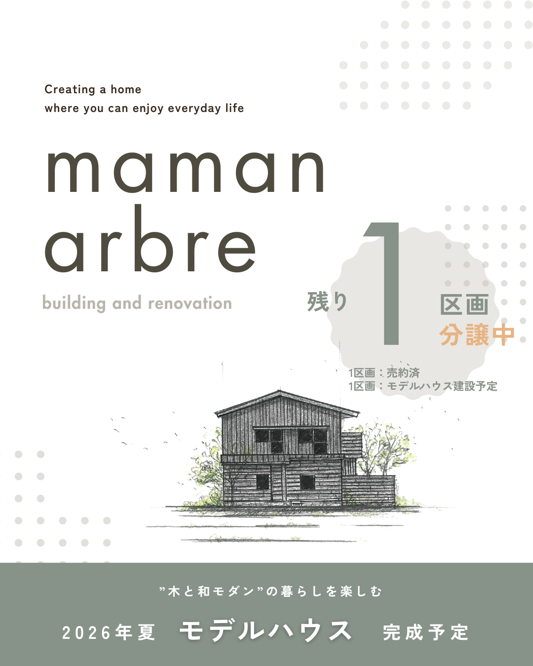 現在、八尾市刑部4丁目にできました新しい分譲地「ママンアルブル」の4区画の中で、1棟のモデルハウスを建設中です